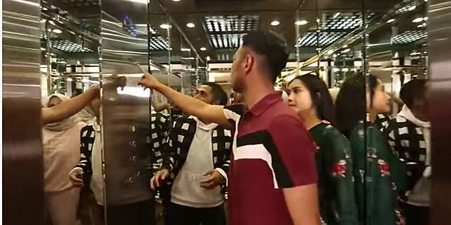 "Kita naik lift dulu ya pemirsa. Biar cepet cin..," kata Momo.