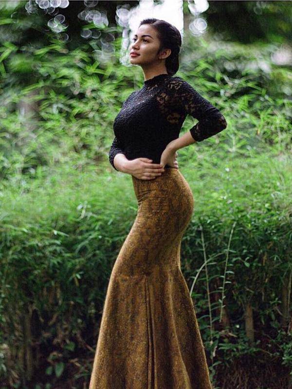 Bintang film Kawin Laris itu mengenakan kebaya hitam serta rok batik ketat sehingga memperlihatkan dengan jelas lekuk tubuhnya yang indah.