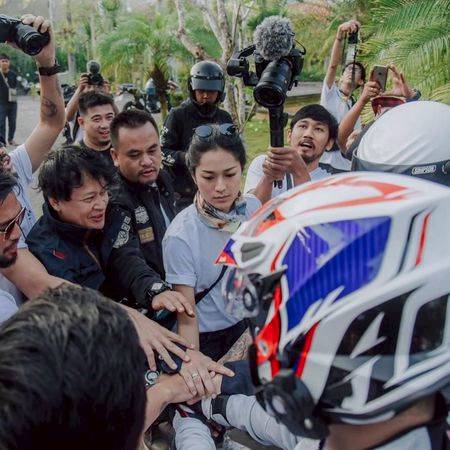 Nggak sendiri dong, Prisia jalani touring dengan teman-teman satu komunitas, ialah komunitas Motorbaik bentukan Ananda Omesh.
